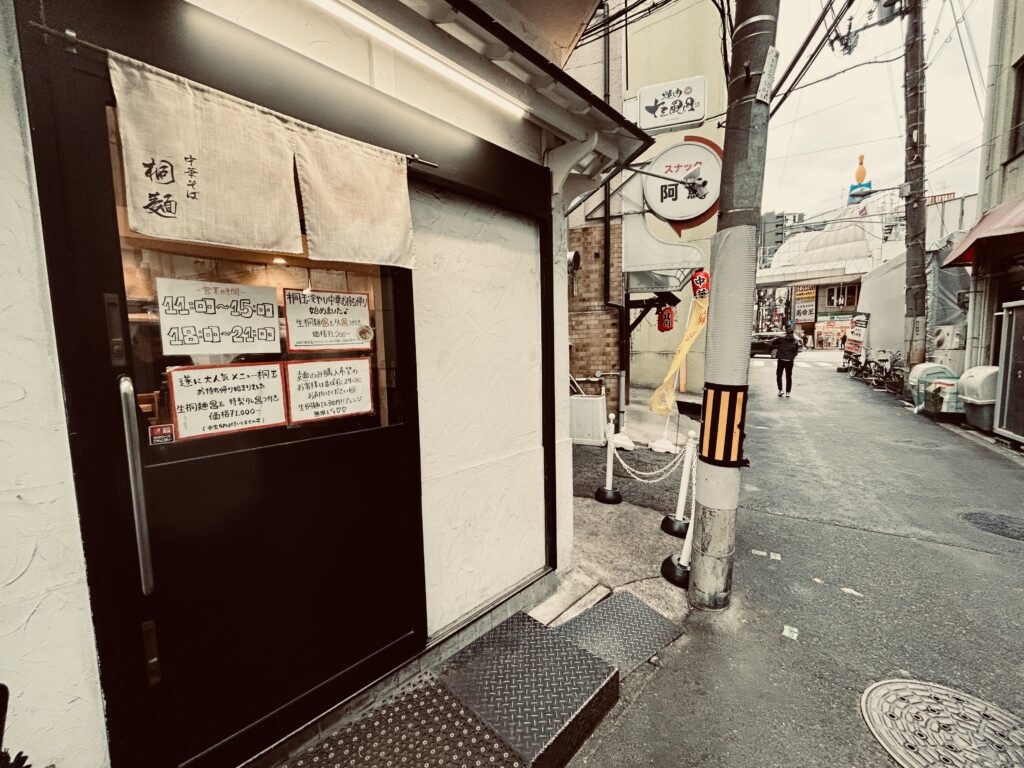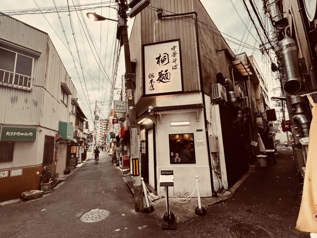 中華そば桐麵總本店在觀光客不多的阪急十三站旁,從北口出站慢行三分鐘即可抵達,位於三角小巷口的尖端,符合腦中那種空間瘦小、日式職人精神濃厚的精巧店面。