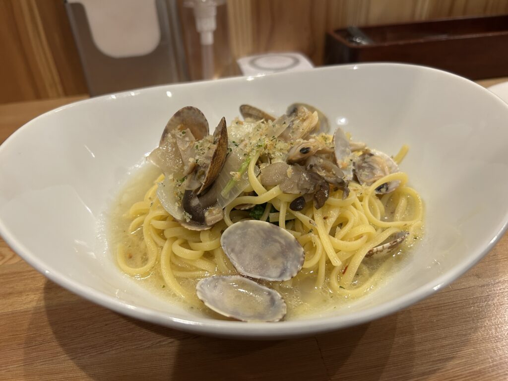 紅醬雞肉及清炒蛤蠣夾著各自的滾騰氣息,基底倒是一樣由店家自豪的手工生麵體承載,或許是眼前桌檯上一整排的番茄糊罐頭加持,紅醬的溫熱暖甜在我的腦中留下了較深的印象。